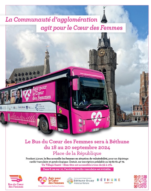 Dans le cadre de la politique santé de la Communauté d’Agglomération Béthune Bruay Artois Lys Romane, le Bus du cœur des femmes sera présent les 18, 19 et 20 septembre 2024, Place de la République à Béthune.