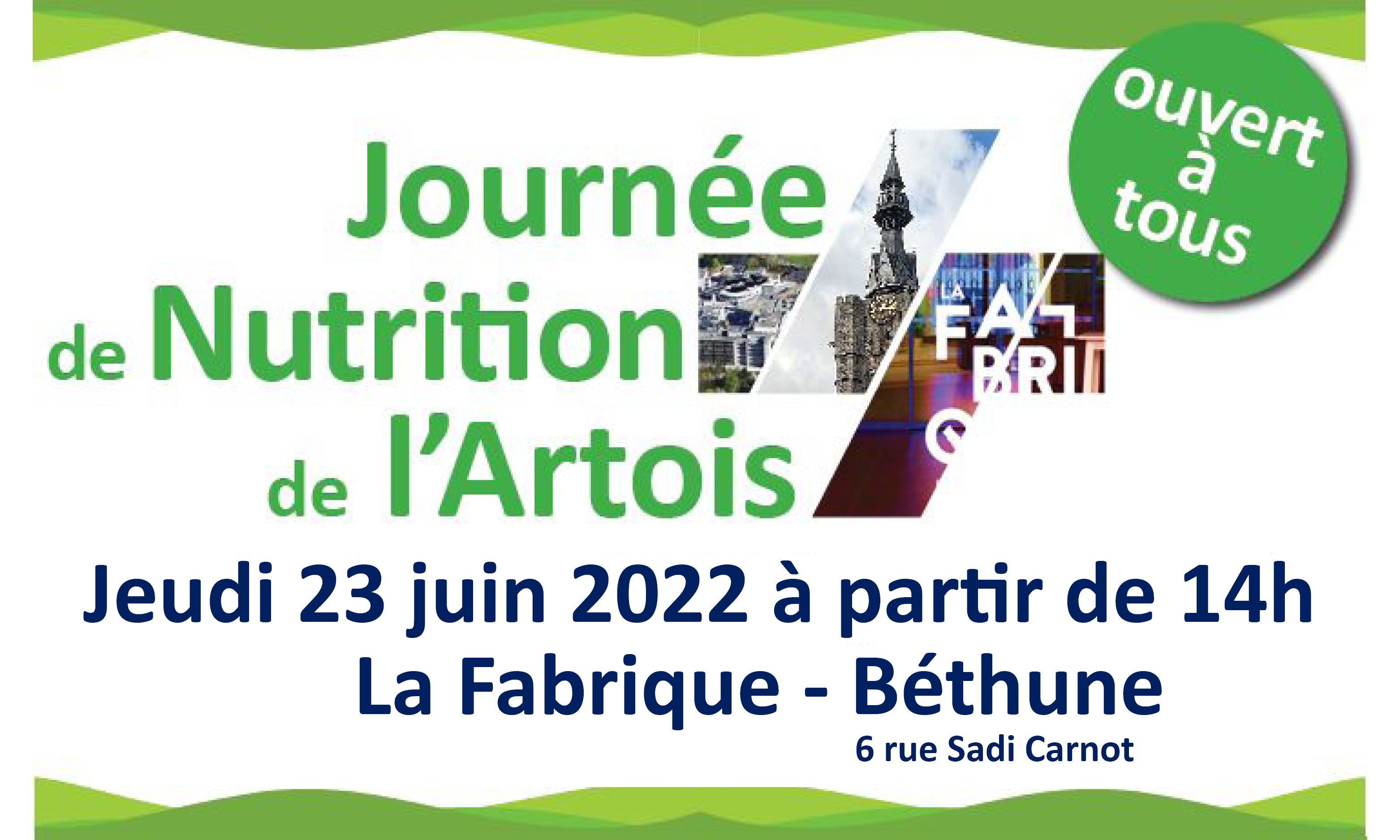 Le Dr Guillaume DERVAUX et son équipe de l’Unité de Nutrition & Troubles des Conduites Alimentaires (TCA) du Centre Hospitalier de Béthune Beuvry, ont le plaisir de vous inviter à la Journée de Nutrition de l’Artois qui aura lieu le jeudi 23 juin 2022 à La Fabrique à Béthune (6 rue Sadi CARNOT à Béthune).