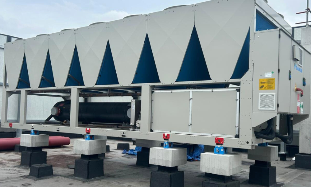 Voici l’une des machines essentielles au futur hôpital : le groupe de production d’eau glacée, situé sur le toit du bâtiment logistique.