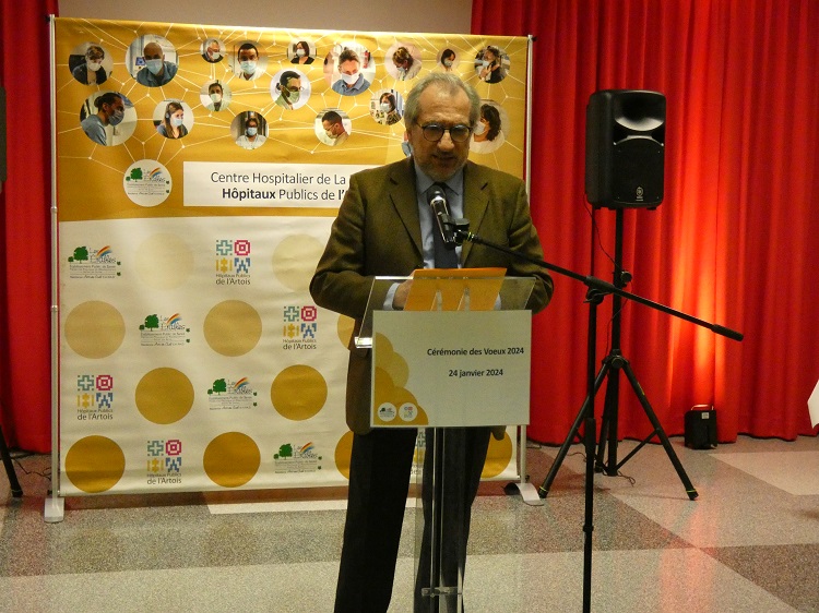 Cérémonie des vœux ce mercredi 24 janvier 2024 dans notre Centre Hospitalier de La Bassée en présence de son Président du Conseil de Surveillance, Frédéric CAUDERLIER, son Directeur Général, Monsieur DONIUS, et sa Présidente de la Commission Médicale d’Etablissement, Dr Sylvie DELATTRE.