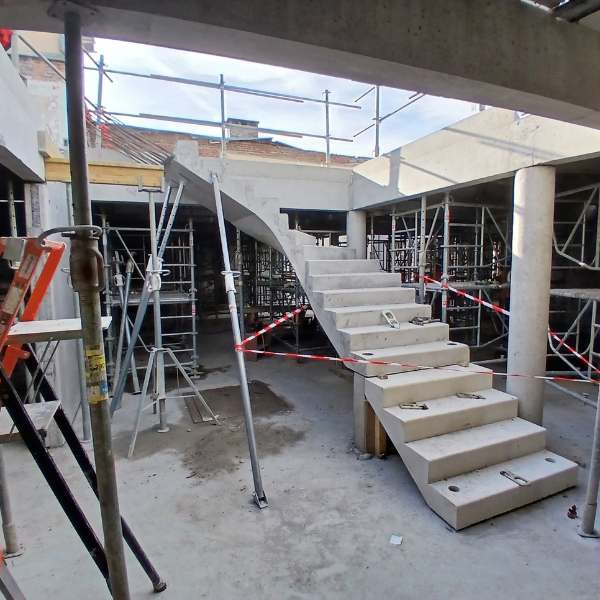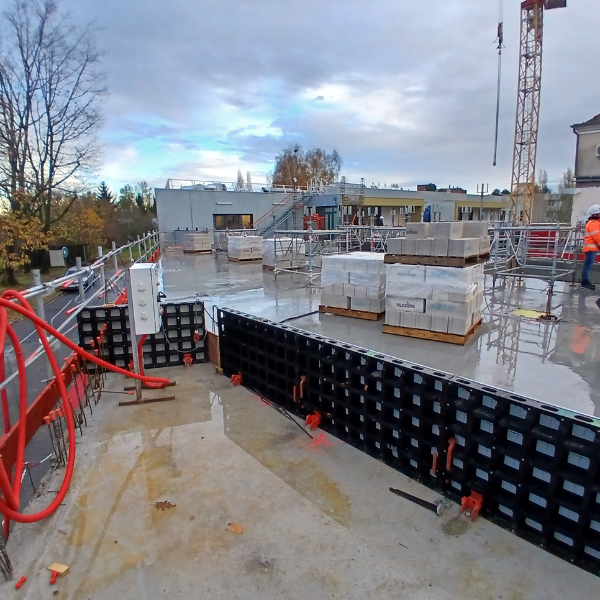 Les fondations sont désormais terminées et le chantier avance conformément au planning. À ce jour, la structure du premier étage est en cours de réalisation.